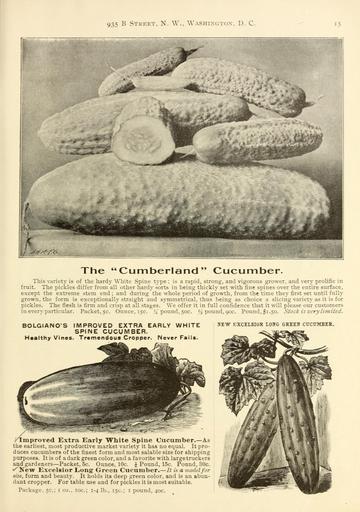 | Keywords: Bolgiano's 1902 catalogue (15730034733).jpg 935 B Street N W Washington D C <br> The Cumberland Cucumber <br> This variety is of the hardy White Spine type ; is a rapid strong and vigorous grower and very prolific in <br> fruit The pickles differ from all other hardy sorts in being thickly set with fine spines over the entire surface <br> except the extreme stem end ; and during the whole period of growth from the time they first set until fully <br> grown the form is exceptionally straight and symmetrical thus being as choice a slicing variety as it is for <br> pickles The flesh is firm and crisp at all stages We offer it in full confidence that it will please our customers <br> in every particular Packet 5c Ounce 15c V pormd 50c pound 90c Pound 1 50 Stock is very limited <br> BOLGIANO'S IMPROVED EXTRA EARLY WHITE <br> SPINE CUCUMBER <br> Healthy Vines Tremendous Cropper Never Fails <br> NEW EXCELSIOR LONG GREEN CUCUMBER <br> /improved Extra Early White Spine Cucumber ” As <br> the earliest most productive market variety it has no equal It pro- <br> duces cucumbers of the finest form and most salable size for shipping <br> purposes It is of a dark green color and a favorite with large truckers <br> and gardeners ” Packet 5c Ounce 10c £ Pound 15c Pound 30c <br> / Kew Excelsior Long Green Cucumber ” It is a model for <br> size form and beauty It holds its deep green color and is an abun- <br> dant cropper For table use and for pickles it is most suitable <br> Package 5c; 1 oz 10c; 1-4 lb 15c; 1 pound 40c 42156265 132756 65911 Page 15 Text http //www biodiversitylibrary org/page/42156265 1902 10 5962/bhl title 65911 F W Bolgiano Co ; Henry G Gilbert Nursery and Seed Trade Catalog Collection Biodiversity Heritage Library Bolgiano's 1902 catalogue tested seeds for the garden and farm Garden Stories Bulbs Plants Catalogs Fruit Garden tools Nurseries Horticulture Seeds Vegetables U S Department of Agriculture National Agricultural Library bhl page 42156265 dc identifier http //biodiversitylibrary org/page/42156265 bhlGardenStories BHLinbloom bulbs plants nurseries horticulture u s department of agriculture national agricultural library bhlgardenstories bhlinbloom Information field Flickr posted date ISOdate 2015-01-23 Check categories 2015 August 24 CC-BY-2 0 BioDivLibrary https //flickr com/photos/61021753 N02/15730034733 2015-08-24 08 54 11 cc-by-2 0 PD-old-70-1923 Bolgiano's 1902 catalogue Photos uploaded from Flickr by Fæ using a script |