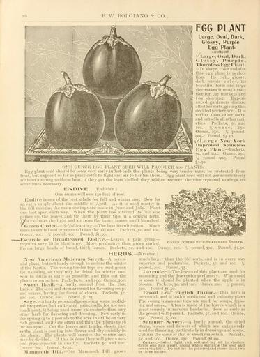 | Keywords: Bolgiano's 1902 catalogue (16349110322).jpg 1 6 <br> F W BOLGIANO CO <br> II EGG PLANT <br> Large Oval Dark <br> Glossy Purple <br> Egg Plant <br> tlERFRUCHT <br> VIjSLTge Oval Dark <br> Glossy Purple <br> Thornless Egg Plant <br> In shape color and size <br> this egg plant is perfec- <br> tion Its rich glossy <br> dark purple color its <br> beautiful form and large <br> size makes it most attrac- <br> tive for the markets and <br> for shipping Experi- <br> enced gardeners discard <br> all other sorts giving this <br> decided preference It is <br> earlier than other sorts <br> and outsells all other vari- <br> eties Packets 5c and <br> ioc y 2 ounce 15c <br> Ounce 25c pound <br> 90CX Pound 3 50 <br> /Large New York <br> Improved Spineless <br> Egg Plant Packets <br> 5c and ioc Ounce 25c <br> pound 90c Pound <br> 3-50 <br> ONE OUNCE EGG PLANT SEED WILL PRODUCE 500 PLANTS <br> Egg plant seed should be sown very early in hot-beds the plants being very tender must be protected from <br> frost but exposed so far as practicable to light and air to harden them Egg plant seed will not germinate freely <br> without a strong uniform heat if they get the least chilled they seldom recover therefor repeated sowings are <br> sometimes necessary <br> ENDIVE Endivien <br> One ounce will sow 150 feet of row <br> Elldive is one of the best salads for fall and winter use Sow for <br> an early supply about the middle of April As it is used mostly in <br> the fall months the main sowings are made in June and July Plant <br> one foot apart each way When the plant has attained its full size <br> gather up the leaves and tie them by their tips in a conical form <br> Tins excludes the light and air from the inner leaves until blanched <br> Green Curled Self-Bleaching The best in cultivation Much <br> more beautiful and ornamental than the old sort Packets 5c and ioc <br> Ounce 20C pound 50c Pound 1 50 <br> Escarole or Broadleaved Endive Leaves a pale green <br> requires very little blanching More productive than green curled <br> Forms large heads of broad thick leaves Packets 5c and ioc Ounce 20c <br> H E R BS Krauter <br> Green Curled Self-Blanching Endive <br> pound 50c Pound 51 50 <br> New American Majoram Sweet A peren- <br> nial plant but not hardy enough to endure the winter <br> of the North The young tender tops are used green <br> for flavoring or they may be dried for winter use <br> Sow in drills as early as possible and thin out the <br> plants to ten inches Packets 5c and ioc Ounce 20c <br> Sweet Basil A hardy annual from the East <br> Indies The seed and stem are used for flavoring soups <br> ami sauces having the flavor of cloves Packets 5c <br> and ioc Ounce 20c Pound 1 25 <br> Sage A hardy perennial possessing some medici- <br> nal properties but cultivated principally for use as a <br> condiment it being used more extensively than any <br> other herb for flavoring and dressing Sow early in <br> the spring 4 to 5 pounds to the acre in drills on very <br> rich ground culthate often and thin the plants to 16 <br> inches apart Cut the leaves and tender shoots just <br> as the plant is coming into flower and dry quickly in <br> the shade The plants will survive the winter and <br> may be divided If this is done they will give a sec- <br> ond crop superior in quality Packets 5c and ioc <br> Ounce 20c Pound 52 00 <br> Mammoth Dill Our Mammoth Dill grows <br> much larger than the old sorts and is in every way <br> superior and preferable Packets 5c and ioc <br> pound 2oc Pound 75 <br> Lavender The leaves of this plant are used for <br> seasoning and the flowers for perfumery When seed <br> is sown it should be planted when the apple is in <br> bloom Packets 5c and ioc Ounce 20c ' 4 pound <br> 50c Pound 1 50 <br> Broad Leaf' English rhyme This herb is <br> perennial and is both a medicinal and culinary plant <br> The young leaves and tops are used for soups dress- <br> ing and sauce A tea is made of the leaves which is a <br> great remedy in nervous headache Sow as early as <br> the ground will permit Packets 5c and ioc Ounce <br> 25c Pound £5 00 <br> Slimmer Savory A hardy annual the dried <br> stems leaves and flowers of which are extensively <br> used for flavoring particularly in dressings and soups <br> Culture the same as that of sweet majoriam Packets <br> 5c and ioc Ounce 15c Pound 1 00 <br> Culture Select light rich soil and lay oil in shallow <br> drills one foot apart along which sprinkle the seed and <br> cover slight ly Do not let the plants stand closer than two <br> or three inches 42156266 132756 65911 Page 16 Text http //www biodiversitylibrary org/page/42156266 1902 10 5962/bhl title 65911 F W Bolgiano Co ; Henry G Gilbert Nursery and Seed Trade Catalog Collection Biodiversity Heritage Library Bolgiano's 1902 catalogue tested seeds for the garden and farm Garden Stories Bulbs Plants Catalogs Fruit Garden tools Nurseries Horticulture Seeds Vegetables U S Department of Agriculture National Agricultural Library bhl page 42156266 dc identifier http //biodiversitylibrary org/page/42156266 bhlGardenStories BHLinbloom bulbs plants nurseries horticulture u s department of agriculture national agricultural library bhlgardenstories bhlinbloom Information field Flickr posted date ISOdate 2015-01-23 Check categories 2015 August 24 CC-BY-2 0 BioDivLibrary https //flickr com/photos/61021753 N02/16349110322 2015-08-24 08 53 00 cc-by-2 0 PD-old-70-1923 Bolgiano's 1902 catalogue Photos uploaded from Flickr by Fæ using a script |