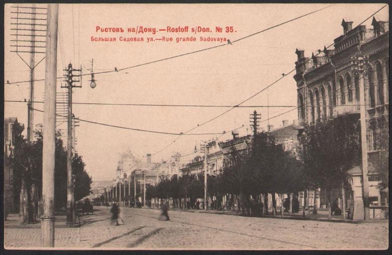 | Keywords: Bolshaya Sadovaya street old 3.jpg ru Большая Садовая улица в Ростове-на-Дону До еволюционная отк ытка 1902 http //antikvariat-rostov ru/rostov_na_donu _bolshaya_sadovaya_ul html Фототипия Ше е абгольц и Ко PD-Rus-Empire Uploaded with UploadWizard Bolshaya Sadovaya street in Rostov-on-Don |
