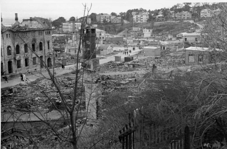 | Keywords: krig bombing ruiner flyangrep byer verdenskrig norge riksarkivet war ruins air raid airraid air attack airattack towns world war ii worldwarii norway molde blackandwhite monochrome outdoor black and white Beskrivelse: Den tyske invasjonen innebar at 24 byer og tettsteder i Norge ble bombet våren 1940. Det gjaldt bl.a. Molde, Kristiansund, Steinkjer og Namsos. Riksarkivet har mottatt 64 fotografier (papirpositiver 9 x 12 cm) som ifølge påskrift på konvolutten skal være tatt i juli 1940 i Kristiansund, Steinkjer og Levanger. Fotografiene har tilhørt ingeniør Hallvard Løken (1908-1995). Han var en dyktig amatørfotograf og kan meget vel ha tatt bildene selv. Takket være god hjelp har vi fått stedsbestemt mange av motivene, men ikke alle, og Riksarkivet mottar gjerne nærmere opplysninger. Arkivreferanse: PA-1667U2_038 The bombing of Molde The German invasion resulted in 24 towns and villages being bombed in the spring of 1940. This included Molde, Kristiansund, Steinkjer and Namsos. The National Archives of Norway has received 64 photographs (paper positives 9 x 12 cm) that according to information on the envelope are taken in July 1940 in Kristiansund, Steinkjer and Levanger. The photos have belonged to engineer Hallvard Løken (1908-1995). He was a good amateur photographer and might very well have taken the photos himself. Thanks to help from others, we have been able to pinpoint many of the locations and their locations, but not all of them, and the National Archives of Norway is very happy to receive further information. Beskrivelse: Den tyske invasjonen innebar at 24 byer og tettsteder i Norge ble bombet våren 1940. Det gjaldt bl.a. Molde, Kristiansund, Steinkjer og Namsos. Riksarkivet har mottatt 64 fotografier (papirpositiver 9 x 12 cm) som ifølge påskrift på konvolutten skal være tatt i juli 1940 i Kristiansund, Steinkjer og Levanger. Fotografiene har tilhørt ingeniør Hallvard Løken (1908-1995). Han var en dyktig amatørfotograf og kan meget vel ha tatt bildene selv. Takket være god hjelp har vi fått stedsbestemt mange av motivene, men ikke alle, og Riksarkivet mottar gjerne nærmere opplysninger. Arkivreferanse: PA-1667U2_038 The bombing of Molde The German invasion resulted in 24 towns and villages being bombed in the spring of 1940. This included Molde, Kristiansund, Steinkjer and Namsos. The National Archives of Norway has received 64 photographs (paper positives 9 x 12 cm) that according to information on the envelope are taken in July 1940 in Kristiansund, Steinkjer and Levanger. The photos have belonged to engineer Hallvard Løken (1908-1995). He was a good amateur photographer and might very well have taken the photos himself. Thanks to help from others, we have been able to pinpoint many of the locations and their locations, but not all of them, and the National Archives of Norway is very happy to receive further information. |