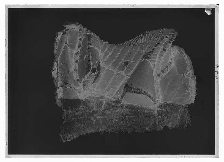 | Keywords: Bomsadel - Livrustkammaren - 26386-negative.tif Bomsadel av svart sammet med stickningar av svart silkegarn i kedjestygn Rektangulära kappor fodrade med brunt läder Tvådelad frambom med snett avskurna ändar ca 530 mm bred ca 110 mm hög <br/><br/>Bakbom med stödbommar ca 650 mm bred 110 mm hög på insidan med täta lodräta stickningar Sadelknapp upptill plan klädd med sammet <br/><br/>Framför frambommen på vardera sidan en rad med sju tennlickor av stål bakom bakbommen på ena sidan sex på andra fem tennlickor <br/><br/>Bommen klädd med brunt skinn Bossor av naturfärgat linne kantade med brunt skinn Fyra sadelgjordsstroppar av vitt läder fodrade med brunt läder Två byglar för stigläder samt läderstropp för svansremmen På framvalvet ögla av läder original caption velvet Färg svart material sammet - silk Färg svart material silke - leather Färg brun vit material läder - steel - hide Färg brun material skinn - linen Färg natur material linne size mm 670 size mm 280 sits LRK Axel Oxenstierna af Södermöre place of origin original filename LN_B04153_007033 43789 inventory number LRK 7192 26386 CC0 Bomsadel - Livrustkammaren - 26386 tif |
