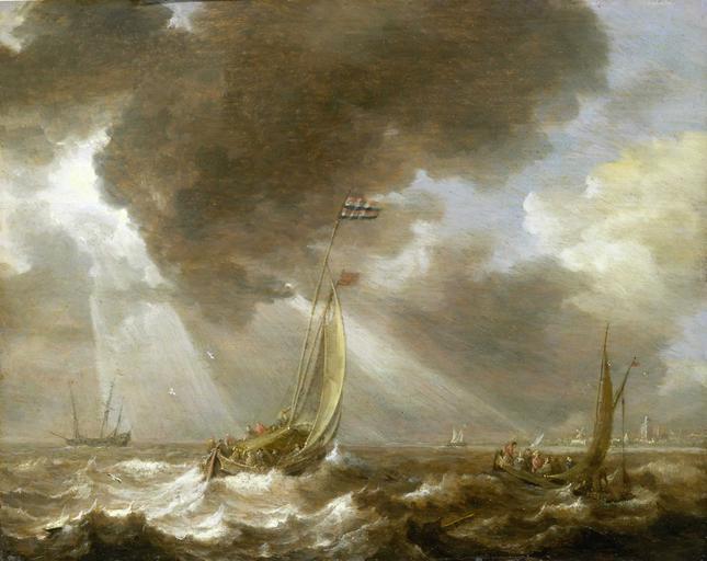 | Keywords: Bonaventura Peeters, the Elder - Dutch Ferry Boats in a Fresh Breeze.jpg Artwork Creator Bonaventura Peeters I This painting shows Dutch boats in a fresh breeze Boats traverse a busy waterway in order to reach the land which is visible on the far right of the composition Two boats are laden with passengers and are ferrying people to and from the town in the distance The largest vessel in the centre left of the painting is a kaag Kaags were light cargo craft used for transporting people and provisions The Dutch double-prince flag of the Amsterdam Admiralty is prominently positioned within the painting flying from the mast of this ferry boat This contributes to the ˜recognizably Dutch ™ character of the scene The vessel sails away from the viewer and holds people sitting around its sides Its passengers face one another and are presumably engaged in social interaction The only exception is the figure of the man in the hat who stares outwards seemingly engaging with the self-aware gaze of the viewer Another man is attending to the rigging On the right the smaller ferry boat is visibly crammed with passengers too Most of whom are economically articulated using tiny daubs of paint This craft is of a flatter construction and sits lower in the water The passengers are seated in the bow and a crew member is busy at the stern Sails of other craft are visible in the distance On the far left a merchant ship is at anchor Two-thirds of the painting is occupied with the sky A storm cloud sits over the centre of the scene However here as in his roughly contemporary work ˜Seascape with Sailors Sheltering from a Rainstorm s 1640 oil oak panel cm 33 38 2 6 Institution National Maritime Museum London object history credit line accession number BHC0760 http //www nmm ac uk/collections/explore/object cfm ID BHC0760 National Maritime Museum Greenwich London Palmer Collection PD-old-100 Paintings by Bonaventura Peeters I in the National Maritime Museum London 1640s paintings in the United Kingdom 17th-century sailing ships in paintings Sailing ships of the Netherlands 17th-century oil on panel paintings in the United Kingdom Admiralty of Amsterdam |
