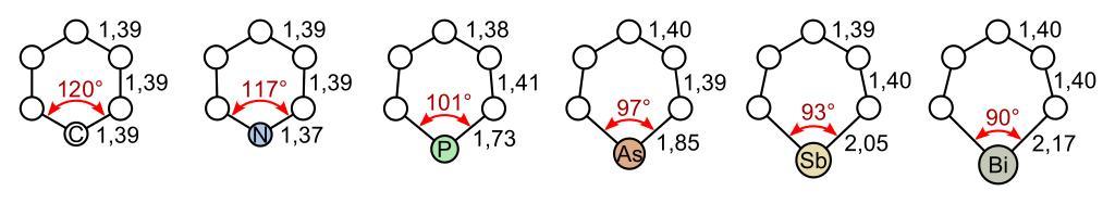 | Keywords: Bond lengths of group 15 heterobenzenes and benzene.svg Bindungslängen und -winkel von Benzol und verschiedenen Heterobenzolen der 15 Gruppe von links nach rechts Benzol Pyridin Phosphabenzol Arsabenzol Stilbabenzol und Bismabenzol Bond lengths and angles of benzene and different group 15 heterobenzenes from left to right benzene pyridine phosphabenzene arsabenzene stilbabenzene and bismabenzene own Zahlenwerte entnommen aus Christoph Elschenbroich Organometallchemie 6 Aufl 2008 Teubner Seite 218 GBS wtuuzCfNTCcC numerical values taken from Christoph Elschenbroich Organometallchemie 6th ed 2008 Teubner page 218 GBS wtuuzCfNTCcC 2010-04-25 Sponk <span class signature-talk >talk</span> Version ohne Benzol Bond_lengths_of_group_15_heterobenzenes svg Version without benzene Bond_lengths_of_group_15_heterobenzenes svg Heterocyclic compounds with 1 ring |