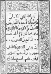 | Keywords: Book of Hours 3.png en This is a page from Kitab salat al-sawai The book of hours first printed in Fano Italy on September 12th 1514 It is considered the first printed arabic book The picture was taken from a book found in Princeton University Library Department of rare books and special collections ar صفحة من كتاب الصلاة السواعي المطبوع في فانو، إيطاليا في 12 أيلول سبتمبر 1514 وهو يعد أول كتاب مطبوع باللغة العربية هذه الصورة من نسخة للكتاب موجودة في مكتبة جامعة برينستون قسم الكتب النادرة والمجموعات الفريدة M Krek The Enigma of the First Arabic Book Printed from Movable Type Journal of Near Eastern Studies 1979 p 204 author 12-9-1514 PD-old-100 Scanned Arabic texts Printed books |