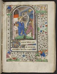 | Keywords: medieval renaissance annunciation illumination book of hours bookofhours picture frame This Book of Hours was copied in Eastern France between 1425 and 1475. The miniature pictured here is one of twelve large miniatures in gold frames, arched at the top and with three or four lines of text underneath. This leaf at the beginning of Matins for the Hours of the Virgin shows the Annunciation, with the angel appearing before the Virgin Mary to tell her that she has been chosen to bear the Son of God. The full ivy-leaf border includes a saddled donkey, a man on a cock’s back, a man ploughing, and a man with a basket on his back. Immediately below the miniature is a 3-line initial decorated in red and blue with white tracery on a gold ground. The second and last lines of text are completed with line-fillers. The Book of Hours was a medieval prayer book used by laymen for private devotion. These books were created for both men and women, but their place in female devotion is particularly noteworthy. The text centres on the Hours of the Virgin, a series of prayers to be said at the eight canonical hours of Matins, Lauds, Prime, Terce, Sext, None, Vespers, and Compline. This Book of Hours was copied in Eastern France between 1425 and 1475. The miniature pictured here is one of twelve large miniatures in gold frames, arched at the top and with three or four lines of text underneath. This leaf at the beginning of Matins for the Hours of the Virgin shows the Annunciation, with the angel appearing before the Virgin Mary to tell her that she has been chosen to bear the Son of God. The full ivy-leaf border includes a saddled donkey, a man on a cock’s back, a man ploughing, and a man with a basket on his back. Immediately below the miniature is a 3-line initial decorated in red and blue with white tracery on a gold ground. The second and last lines of text are completed with line-fillers. The Book of Hours was a medieval prayer book used by laymen for private devotion. These books were created for both men and women, but their place in female devotion is particularly noteworthy. The text centres on the Hours of the Virgin, a series of prayers to be said at the eight canonical hours of Matins, Lauds, Prime, Terce, Sext, None, Vespers, and Compline. |
