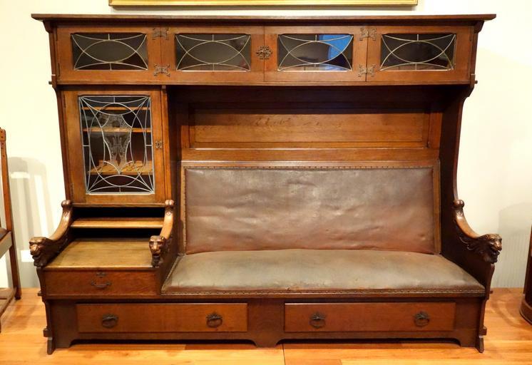 Keywords: Bookcase settle, designed by Frederick H. Meyer, made by Stanley Kopersky, c. 1904, oak, glass, lead - De Young Museum - DSC00705.JPG en Exhibit in the De Young Museum San Francisco California USA This artwork is in the public domain because it was first published in the United States before 1923 Photography was permitted in the museum without restriction 2013-11-05 15 49 17 own Daderot other versions PD-1923 cc-zero Furniture in the De Young Museum Uploaded with UploadWizard Frederick Heinrich Wilhelm Meyer |