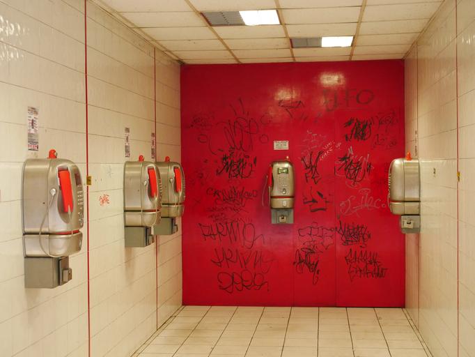 Keywords: booth phone telecoms public cell equipment device connection appliance to call contact telephone fluorescent lighting light smudgy dirty interview unattractive call communication