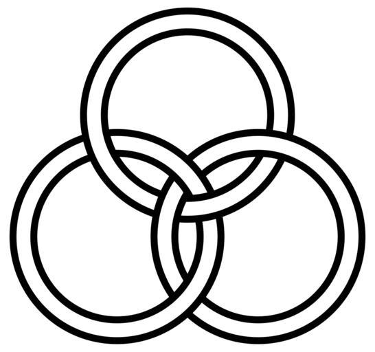 | Keywords: Borromean-rings minimal-overlap.svg The Borromean rings configuration of knot theory depicted using same-size circles without an area enclosed by all three circles For a depiction with central overlap see Image BorromeanRings svg etc For configurations of three linked rings which are not Borromean see File Two-representations-of-L6n1-link-as-linked-circles svg Self-made graphic converted from a version of the following vector PostScript source code <pre> 300 282 translate/plr dup 3 2 roll 72 mul 90 add dup 3 1 roll cos mul 3 1 roll sin mul def 23 1130905 setlinewidth /A 0 5 4 4 5 100 plr 78 0 360 arc closepath stroke for 0 182 plr 78 0 360 arc closepath stroke def A 11 5565453 setlinewidth 1 setgray A showpage EOF</pre> 2009 AnonMoos Borromean rings Outline knots and links Knots and links on transparent background Circular Borromean rings 3 component links 6 crossing number knots and links Alternating knots and links 9 stick number knots and links Images with PostScript source code |
