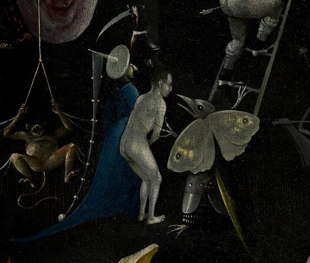 | Keywords: Bosch, Hieronymus - The Garden of Earthly Delights, right panel - Detail Monkey, man with blue clothes and Butterfly monster.jpg Artwork The Garden of Earthly Delights right panel - Detail Monkey man with blue clothes and Butterfly monster left oil panel institution Museo del Prado 70px Google Earth Ultra High Resolution photos of the Museo Nacional del Prado<sup><small> http //www museodelprado es/en/the-collection/sueltas/masterpieces-of-the-prado-museum-with-google-earth/ How-To </small></sup> Creator Hieronymus Bosch Other versions PD-old-100-1923 The Garden of Earthly Delights right panel Monkey man with blue clothes and Butterfly monster People with monkeys in art Monsters in paintings pointed hats Butterfly monsters Details of paintings from Prado in Google Earth Details of The Garden of Earthly Delights 4 3 Uploads by Mattes from external sources Monsters Monsters with humans |