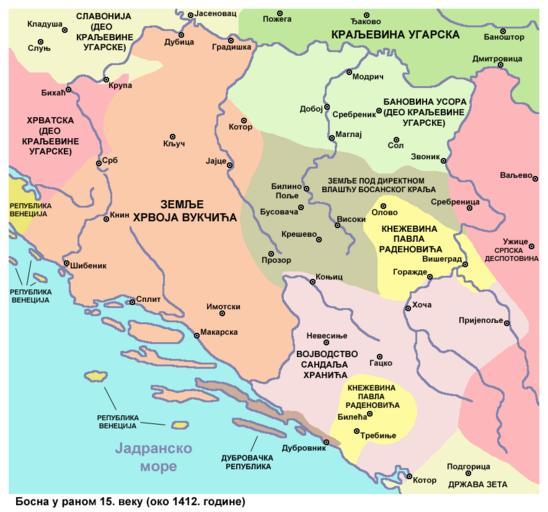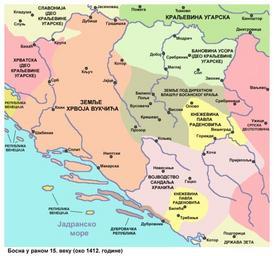 | Keywords: Bosnia around 1412-sr.png en Bosnia in the early 15th century around 1412 - Lands of Hrvoje Vukčić Duchy of Sandalj Hranić Principality of Pavle Radenović Banovina Usora and Lands under the direct authority of the Bosnian king sr Босна у аном 15 веку око 1412 године - Област Х воја Вукчића Војводство Сандаља Х анића Кнежевина Павла Раденовића Бановина Усо а и земље под ди ектном влашћу босанског к аља own PANONIAN 2014 Cc-zero References Istorijski atlas Geokarta Beograd 1999 Vladimir Ćorović Ilustrovana istorija Srba knjiga treća Beograd 2006 Školski istorijski atlas Zavod za izdavanje udžbenika SR Srbije Beograd 1970 http //www rodnikraj eu/index_htm_files/247 png http //www hercegbosna org/STARO/images/zem20 jpg Maps of the Kingdom of Bosnia Maps of the history of Republika Srpska Maps of the Serbian Despotate Maps of the Principality of Zeta in the 15th century Maps of the history of Croatia in the Middle Ages Maps of the history of Slavonia Maps of the history of Dalmatia Maps of the Republic of Ragusa Maps in Serbian |
