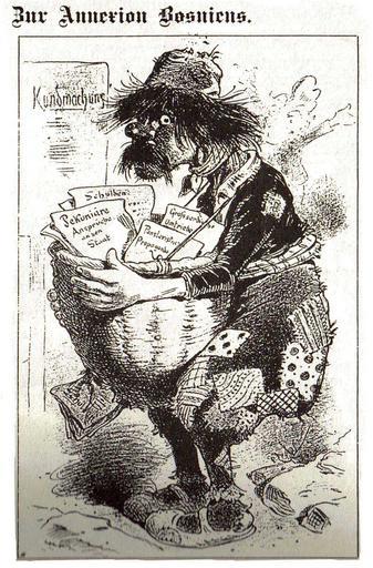 Keywords: Bosniake2.jpg en Caricature of a Bosnian in the Austrian humourous magazin Kikeriki 1908 de Karikatur eines Bosniers in der österreichischen humoristischen Wochenschrift Kikeriki anlässlich der Annexion Bosnien-Herzegowinas durch die Donaumonarchie 1908 Bildunterschrift Gott sei Dank jetzt g'hört er ganz uns <br> Die Zettel im Korb beziehen sich auf Bosnien und tragen die Aufschriften Schulden Pekuniäre Ansprüche an den Staat Panslawistische Propaganda Großserbische Umtriebe <br> Source Kikeriki Jg 48 1908 Nr 83 v 15 Oktober 1908 Titelblatt 1908 cartoons 1900s political cartoons People of Bosnia and Herzegovina Bosnian Crisis Kikeriki PD-Art Artworks missing infobox template |