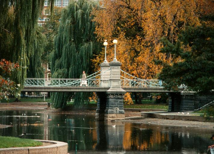 | Keywords: Boston Public Garden Suspbridge.jpg en Boston MA U S - the world's smallest suspension bridge is in Public Garden Own Chiefhuggybear 1989 1989 in Boston Lagoon bridge in the Boston Public Garden Autumn in Boston Bridges photographed in 1989 Autumn 1989 in the Northern Hemisphere Water reflections of trees in the United States |