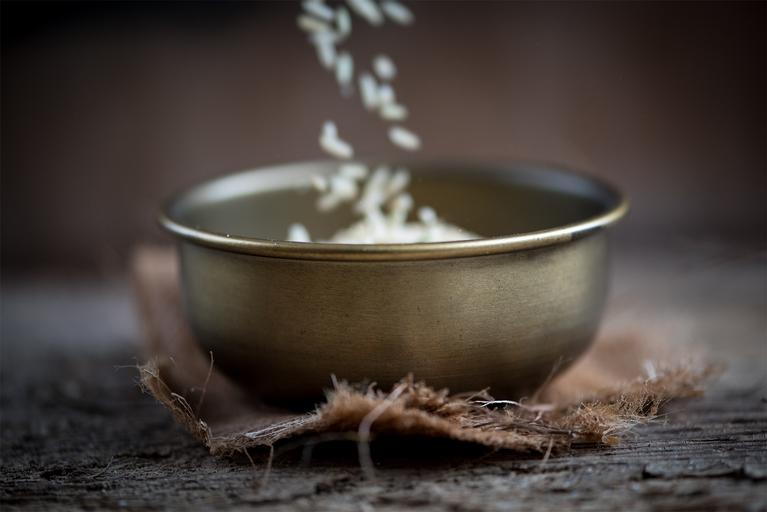 Keywords: bowl brass bowl vessel filling a trickle in motion rice close food-photography