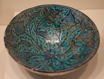| Keywords: Bowl with floral design, Iran, Ilkhanid period, first half of 14th century, earthenware with black painting under turquoise glaze - Cincinnati Art Museum - DSC04057.JPG  en Exhibit in the Cincinnati Art Museum Cincinnati Ohio USA This artwork is in the public domain because the artist died more than 70 years ago Photography was permitted in the museum without restriction 2013-05-14 11 23 12 own Daderot cc-zero Ilkhanid pottery in the Cincinnati Art Museum Uploaded with UploadWizard Turquoise of Nishapur |