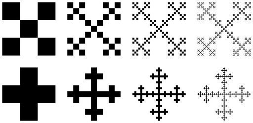 Keywords: Box or Vicsek Fractal 4-iterations.svg Four iterations of a box fractal or Vicsek fractal derived by iteratively replacing a square with a saltire or cross of five smaller squares on a 3-by-3 subgrid Top Four iterations of the saltire form of the fractal Bottom Four iterations of the cross form of the fractal The second iteration is a form of the cross crosslet symbol of traditional heraldry Self-made graphic converted from the following vector PostScript source code <pre> 5 dup scale/sq 3 mul exch 3 mul exch moveto 3 0 rlineto 0 3 rlineto -3 0 rlineto closepath fill def/X 0 1 sq 1 1 sq 2 1 sq 1 0 sq 1 2 sq def/T 0 0 sq 1 1 sq 2 2 sq 0 2 sq 2 0 sq def/x 0 1 X1 1 1 X1 2 1 X1 1 0 X1 1 2 X1 def/t 0 0 T1 1 1 T1 2 2 T1 0 2 T1 2 0 T1 def/X1 9 mul exch 9 mul exch gsave translate X grestore def/T1 9 mul exch 9 mul exch gsave translate T grestore def/X2 27 mul exch 27 mul exch gsave translate x grestore def/T2 27 mul exch 27 mul exch gsave translate t grestore def/xx 0 1 X2 1 1 X2 2 1 X2 1 0 X2 1 2 X2 def/tt 0 0 T2 1 1 T2 2 2 T2 0 2 T2 2 0 T2 def/X3 81 mul exch 81 mul exch gsave translate xx grestore def/T3 81 mul exch 81 mul exch gsave translate tt grestore def/sqq /s exch def 1 7 8 setrgbcolor 0 0 moveto s 0 rlineto 0 s rlineto s neg 0 rlineto closepath fill 0 setgray def gsave 10 10 translate 27 dup scale 9 sqq X 0 11 translate 9 sqq T grestore gsave 307 10 translate 9 dup scale 27 sqq x 0 33 translate 27 sqq t grestore gsave 604 10 translate 3 dup scale 81 sqq xx 0 99 translate 81 sqq tt grestore gsave 901 10 translate 243 sqq 0 1 X3 1 1 X3 2 1 X3 1 0 X3 1 2 X3 0 297 translate 243 sqq 0 0 T3 1 1 T3 2 2 T3 0 2 T3 2 0 T3 grestore showpage EOF</pre> 2009 AnonMoos For the fifth iteration of the cross variant see File Box fractal svg center thumb 490px Box fractal svg Box fractals Images with PostScript source code Order 4 |