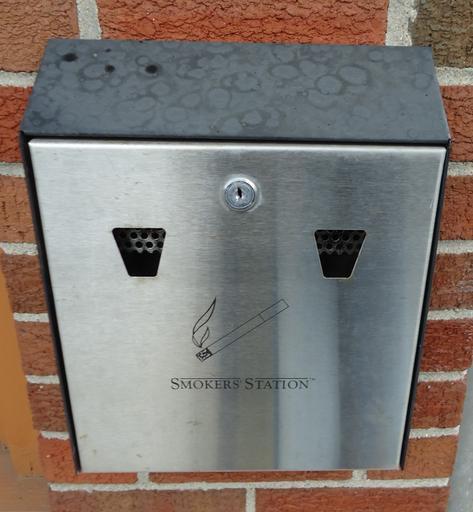 | Keywords: Box used to extinguish cigarettes.JPG en A receptacle used I believe to dispose of cigarette butts It was hanging on a wall of the Berkeley Heights NJ train station 2014-05-08 own Tomwsulcer cc-zero Uploaded with UploadWizard Cigarette-stub bins Wall mounted ashtrays |