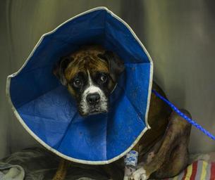 Keywords: boxer dog canine animal pet neck cone elizabethan collar e-collar brown white domestic mammal portrait cute