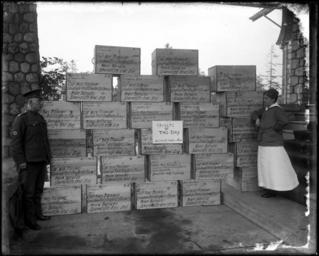 | Keywords: blackandwhite monochrome architecture stonework outdoor ruins photo border black and white Boxes to be sent overseas during World War 1 VPL 15523A Date: Unknown Photographer/Studio: Frank, Leonard Content: Military personnel and woman standing beside in large pile of boxes. A sign on the front of boxes reads 'results of Tag Day Hart McHarg Aux' Topic: World War, 1914-1918, Postal service, Military uniforms, Military history Organization: Hart McHarg Auxiliary Location: British Columbia - Vancouver More information on our historical photograph collection: www.vpl.ca/historicalphotos Boxes to be sent overseas during World War 1 VPL 15523A Date: Unknown Photographer/Studio: Frank, Leonard Content: Military personnel and woman standing beside in large pile of boxes. A sign on the front of boxes reads 'results of Tag Day Hart McHarg Aux' Topic: World War, 1914-1918, Postal service, Military uniforms, Military history Organization: Hart McHarg Auxiliary Location: British Columbia - Vancouver More information on our historical photograph collection: www.vpl.ca/historicalphotos |