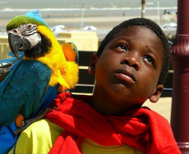 Keywords: boy child portrait parrot animal bird colorful tame sit feather shoulder child and animal holiday travel leisure more dark skinned