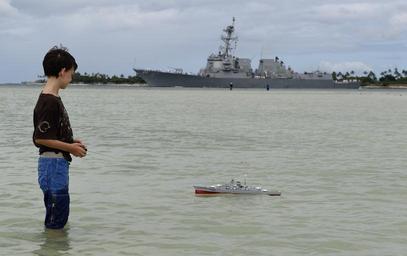 Keywords: boy playing toy boats contrast navy ship child kid fun water ocean wading big and little activity radio control port