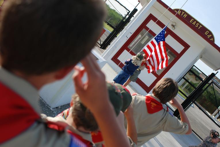 Keywords: Boy Scout Remembrance DVIDS97908.jpg en Members of Boy Scouts Troop 435 and Cub Scouts Troop 3401 from Guantanamo Bay Cuba take down the national ensign while the rest of the scouts render honors during a flag flying ceremony at the Northeast Gate on U S Naval Station Guantanamo Bay June 17 2008 The flags will be sent to the families of the Boy Scouts killed when a tornado went through a western Iowa camp June 12 2008 The Northeast Gate separates the naval station from the rest of Cuba 2008-06-17 Petty Officer 2nd Class Nathaniel Moger https //www dvidshub net/image/97908 080617-N-+++++-068 2008-06-27 16 10 GUANTANAMO BAY CU PD-USGov-Military-Navy Naval Station Guantanamo Bay Images from DoD uploaded by Fæ |