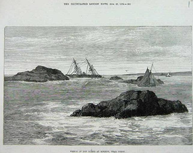 Keywords: Boyne 1875.jpg Illustrated London News engraving of the shipwreck of the packet boat Boyne foundering off the Ponant Islands Brittany in 1875 fr Naufrage du paquebot Boyne au large des iles Molène près de Brest 1875 http //www wrecksite eu/wreck aspx 135680 Author PD-old 1875 engravings 1875 in Bretagne Archipel de Molène Historical images of Finistère Illustrated London News ships Royal Mail Steam Packet Company Ships built in 1871 Shipwrecks in art |