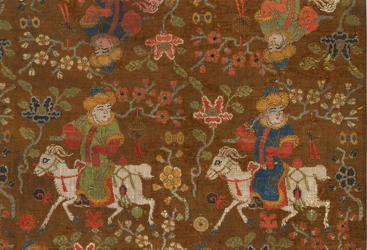 | Keywords: Boys riding goats, 15th-16th C.jpg en RH3564 Textile Panel 9 x 14 in 23 x 34 cm 15th/16th Century Provenance Spink A panel of silk brocade with ˜goat riders ™ pattern The brown ground is woven with a repeat pattern of boys riding on the backs of goats bearing birds in cages suspended from branches of prunus blossom over their shoulders 9 000 http //www hali com/news/hollander-collection-chinese-central-asian-silk-textiles-online-exhibition-sale/ Unknown Chinese weaver Photo by gallery 15th/16th century PD-old-100 16th-century textiles Brocade Files uploaded by PDTillman Textiles of the Ming Dynasty Goats in art Spink Auctions Taken with Hasselblad H5D-200c MS |