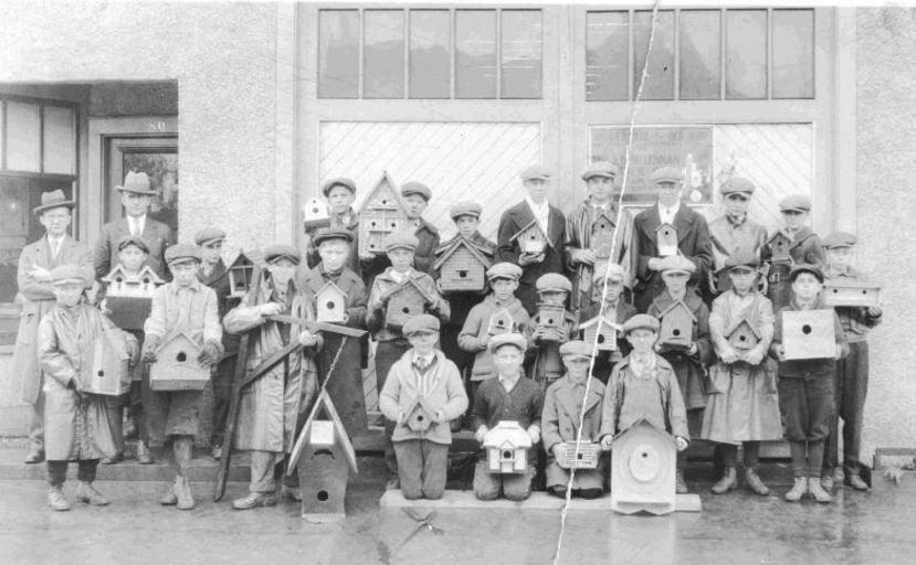 | Keywords: bird houses birdhouses hobbies children ontario canada history thunder bay thunderbay crafts port arthur portarthur boys blackandwhite monochrome black and white Date: c. 1922 Description: Postcard photo of a group of young students standing in front of a building with no. 80 on the doorway. Each student holds a birdhouse that they likely made themselves. Photo might possibly show students from St. James School. Accession No.: 974.45.1 Date: c. 1922 Description: Postcard photo of a group of young students standing in front of a building with no. 80 on the doorway. Each student holds a birdhouse that they likely made themselves. Photo might possibly show students from St. James School. Accession No.: 974.45.1 |