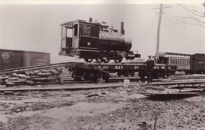 | Keywords: rathbun company rathbuncompany locomotives bay of quinte railway bayofquinterailway railwayworkers 1900s railway cars railwaycars outdoor Reproduction of a print made from negative HMR2-09-14b, showing a locomotive loaded on to a Bay of Quinte Railway flat car in April 1908. Other cars are visible in the background. The photograph was taken by Harold McMurrich Rathbun, probably outside the Rathbun Company's car works in Deseronto, Ontario. Reproduction of a print made from negative HMR2-09-14b, showing a locomotive loaded on to a Bay of Quinte Railway flat car in April 1908. Other cars are visible in the background. The photograph was taken by Harold McMurrich Rathbun, probably outside the Rathbun Company's car works in Deseronto, Ontario. |