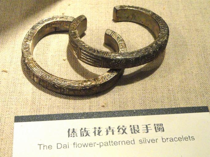 | Keywords: Bracelet - Yunnan Nationalities Museum - DSC04194.JPG Dai silver bracelets Jewelry in the Yunnan Nationalities Museum Kunming Yunnan China I took this photograph 2011-08-13 02 03 26 Daderot Public domain Jewellery in the Yunnan Nationalities Museum Dai jewelry |