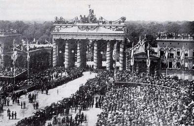 Keywords: Brandenburger tor 1871.jpg The Brandenburg Gate with decorations and conscripted Prussian troops after the Franco-Prussian War 1871 Das Brandenburger Tor mit Festschmuck mit einziehenden preußischen Truppen nach dem deutsch-französischen Krieg 1871 Source de wikipedia org <nowiki>07 10 20 Mär 2005 APPER 1000 x 650 162998 Byte Brandenburger Tor mit Festschmuck 1871 / gemeinfrei </nowiki> PD-old Brandenburg Gate 19th century Pariser Platz in the 19th century 1871 in Berlin Photographs of Franco-Prussian War |