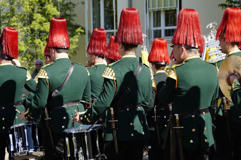 Keywords: brass band music band bavarian uniform costume chapel pageant human street festival celebrate instrument music musicians festival tradition musician germany move upper swabia marching men blowers city guard pickelhaube guard soldiers
