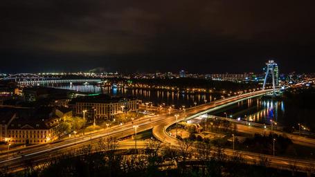 Keywords: bratislava city slovakia bridge street lights night illuminated the danube view river architecture