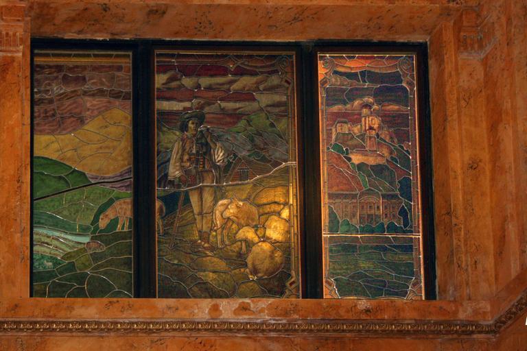 | Keywords: Bratislava MK SR Dvorana2.jpg sk Vitráž v Dvorane budovy ministerstva kultúry SR na námestí SNP V Bratislave own Peter Zelizňák 27 februára 2009 Own work all rights released Public domain PD self Stained glass windows in Bratislava Images by Peter Zeliznak People on stained glass windows in Slovakia Animals on stained glass windows |