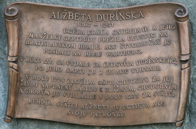 | Keywords: Bratislava park hradneho nadvoria.jpg sk V párku hradného nadvoria bratislavského hradu je bronzová plastina Alžbety Durínskej-Uhorskej Na podstavci sochy je bronzová informačná tabuľa own Peter Zelizňák 12 júna 2009 Own work all rights released Public domain Plaques in Bratislava Images by Peter Zeliznak Self-published work |