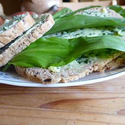 Keywords: bread picnic eat meal bear's garlic whole wheat bio bear's garlic butter crust slice of bread arranged delicious healthy frisch green herb butter