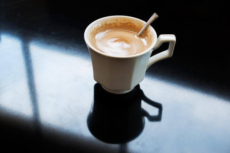Keywords: breakfast coffee cup of coffee indoor milk reflexion spoon window