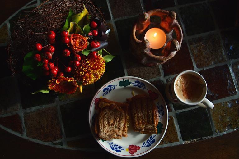 Keywords: breakfast sandwich candle coffee sign mug dim cosy dark candle light