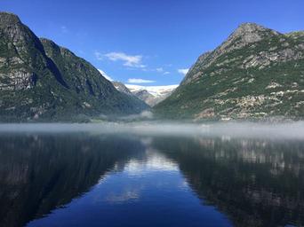 Keywords: breen glacier fjord norway water lake mountains fog over water viewing