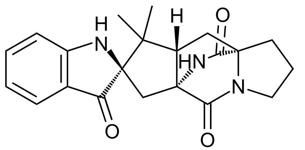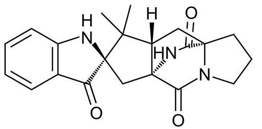 Keywords: Brevianamide A.svg Chemical structure of brevianamide A Own 14 01 1 June 2011 UTC Ed Edgar181 Indole alkaloids Spiro compounds Diketopiperazines