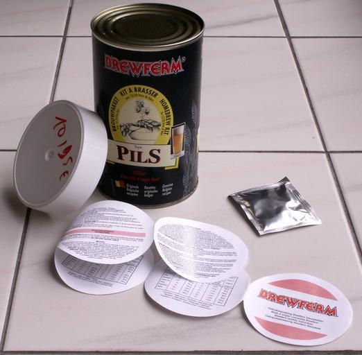 | Keywords: BREWFERM Pils Beer Homebrewing Kit.jpg en A picture of a Belgian BREWFERM beerkit As can be seen the kit includes hopped malt extract yeast and instructions on how the beer is to be made using this kit Beer made using these kits is very inexpensive 10 ‚¬ for 20l and allows the beer to be made calorie-poorer by adding no sugar at all that is transformed into ethanol This will btw also cause the beer to be lower in ethanol percentage Own KVDP 2008-07-03 Homebrewing Beerkits | ||||