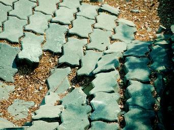Keywords: bricks broken road pattern zigzag green aged sunken scattered rows ground surface street brickwork damaged aging