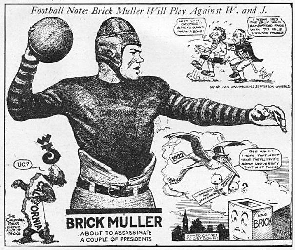 | Keywords: BrickvsWJ.jpg Editorial cartoon from w 1922 Rose Bowl Cal's Brick Muller about to assassinate a couple of presidents in reference to Washington Jefferson College The Cal coach Andy Smith initially refused to play the Presidents because it recruited older players than the average age at Cal He finally agreed after which this cartoon was published http //www donnan com/images/BrickvsWJ jpg Image from http //www donnan com/Murphy htm Robert Murphy Washington Jefferson College Football 1922 Author Pre-1923 Public domain Template PD-old 1922 Rose Bowl Harold Muller American football in art |