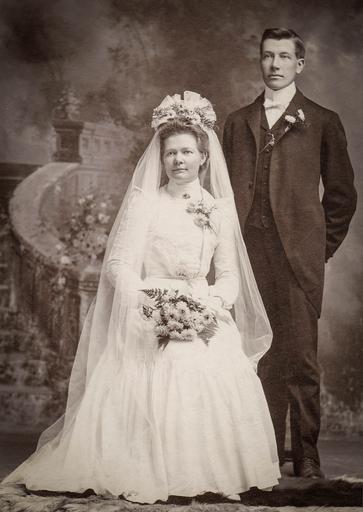 Keywords: bride groom wedding vintage retro early twentieth century couple love marriage portrait bridal married wedding bouquet wife husband
