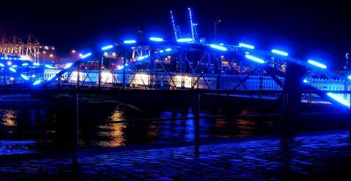 Keywords: bridge illuminated night port night photograph hamburg speicherstadt