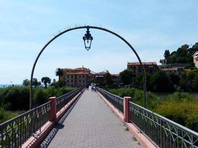 Keywords: bridge pedestrian bridge river roia lamp street lamp street lighting arch light crossing ventimiglia homes city north italy province of imperia imperia liguria riviera border town italy france bishop city seaside resort spa