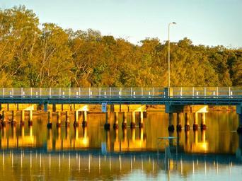 Keywords: bridge reflection sunset scene beautiful scenic outdoors evening water river dusk twilight