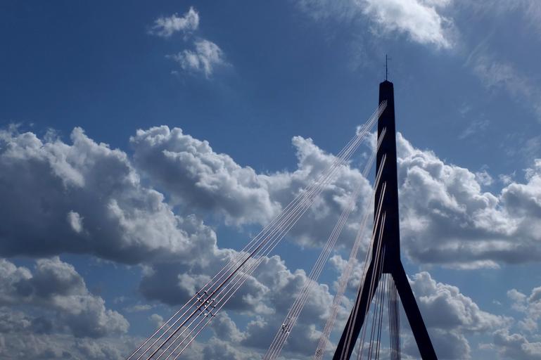 Keywords: bridge rheinbrücke suspension bridge flehe bridge düsseldorf architecture technology enormous strong steel construction stahlbau building pylon large traffic road technology and nature sky blue clouds dramatic clouds back light in the lens