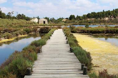Keywords: bridge salins wooden bridge stilt sea peyriac france path atypical hiking passage sea water