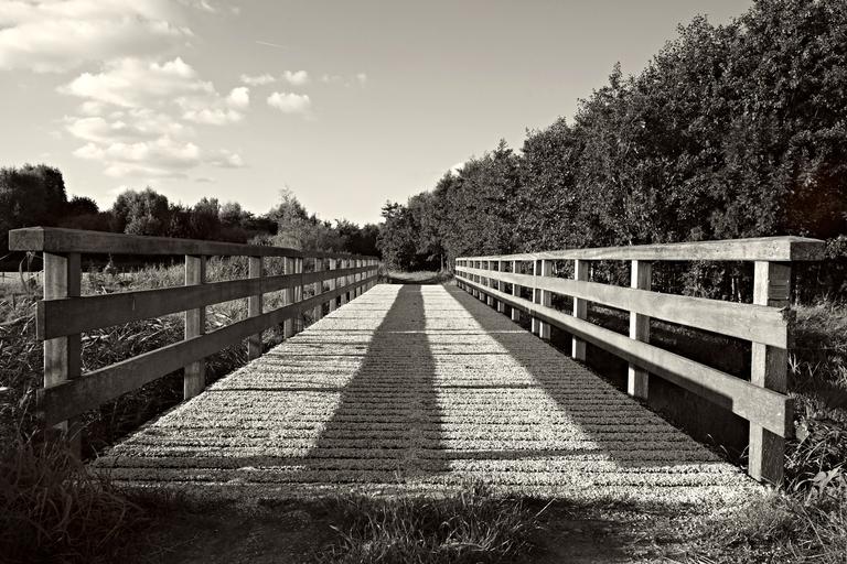 Keywords: bridge structure crossing wooden bridge landscape shadow shadow play pattern rail hand rail monochrome bw photography